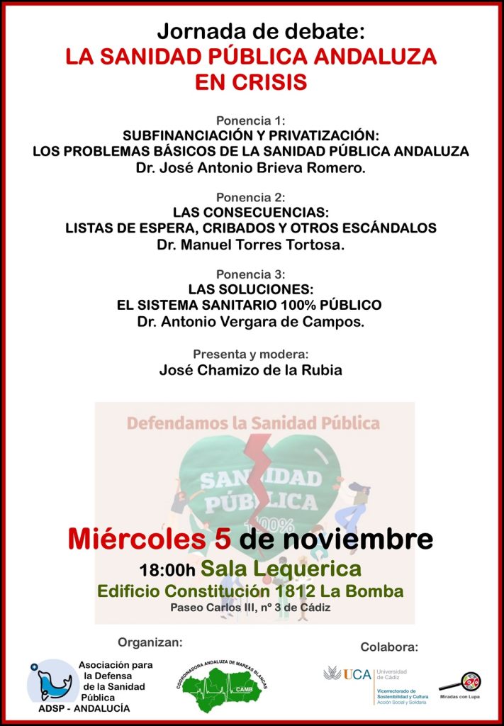 Actividad organizada por la Asociación para la Defensa de la Sanidad Pública de Andalucía y la Coordinadora Andaluza de Mareas Blancas con la colaboración del Ciclo UCA Miradas con Lupa de la Oficina de Acción Social y Solidaria del Vicerrectorado de Sostenibilidad y Cultura de la Universidad de Cádiz.
