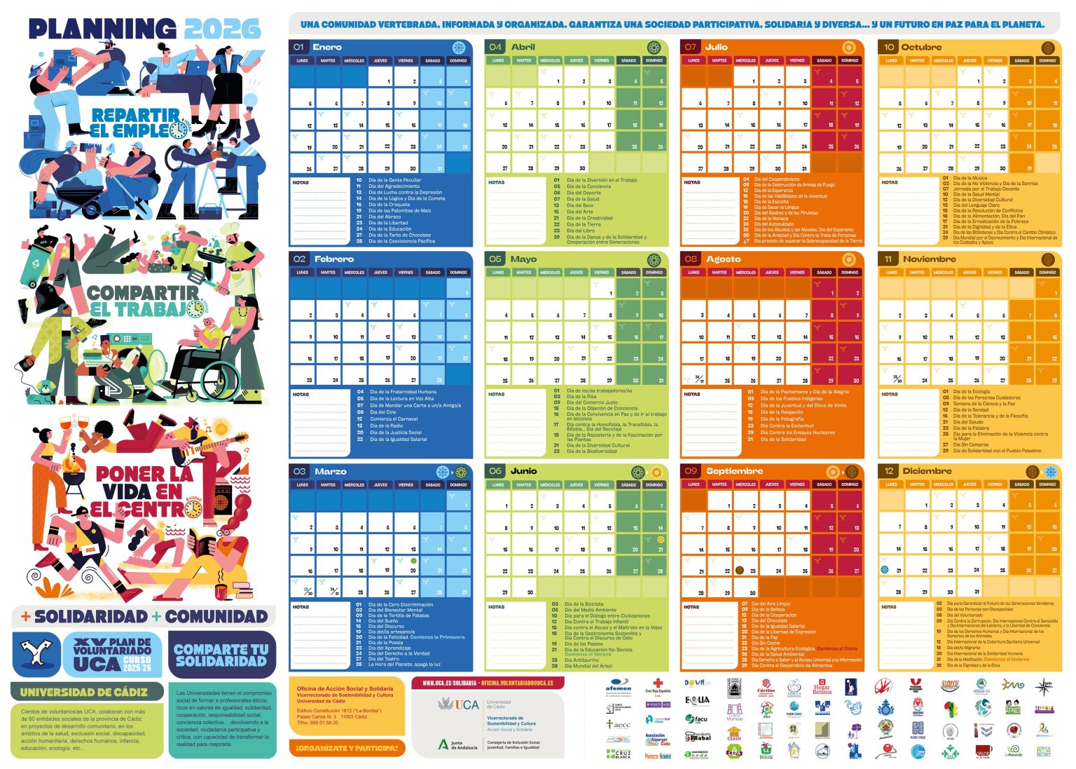 La edición del Planning de Voluntariado UCA para el año 2026, diseñado por Rebombo, de tamaño 60 cm x 84 cm, dispone de espacio para escribir e indica las principales fechas de celebración internacional relacionadas con la acción social y solidaria, este año especialmente dedicadas a las que tienen relación con el empleo, el trabajo y la vida.